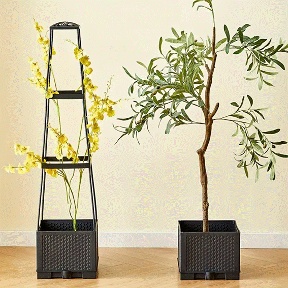 Conjunto Torre de Tomate com Vaso Autoirrigável e Suporte Treliça – Com vaso autoirrigável e treliça de apoio, esta torre é perfeita para sustentar plantas trepadeiras, hortaliças e flores, sendo uma opção versátil para jardins internos ou externos.