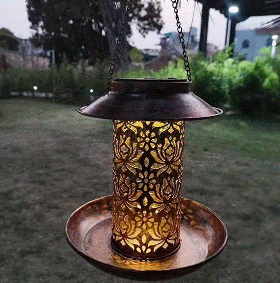 Comedouro para pássaros à prova d'água movido a energia solar – Design rústico em metal, perfeito para atrair pássaros e decorar seu jardim. Alimente os pássaros enquanto embeleza o ambiente com um item resistente e sustentável.
