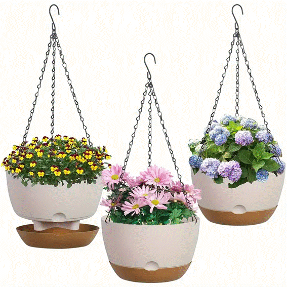 Conjunto de 3 Cachepôs Pendentes de 20,32 cm com Furos de Drenagem, Correntes e Pratos Removíveis – Fácil Montagem e Limpeza – Um conjunto elegante e prático, ideal para o cuidado das suas plantas, com furos de drenagem e pratos removíveis que facilitam a manutenção.