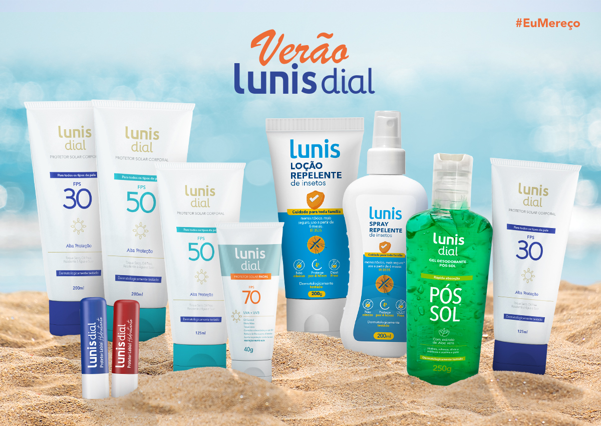 Destaque para a linha de protetores solares Lunis Dial, que oferece ampla proteção contra os raios UVA e UVB em diferentes versões. As opções corporais estão disponíveis nos fatores FPS 30 e 50, com embalagens de 125 mL e 200 mL, e trazem toque seco, textura leve e resistência à água e ao suor, que são ideais para o uso diário e momentos de lazer ao ar livre. Para o rosto, o protetor facial FPS 70 conta com ácido hialurônico e niacinamida, que auxiliam na hidratação e no controle da oleosidade por até 8 horas, garantindo uma pele protegida e com aspecto saudável mesmo nos dias mais quentes.